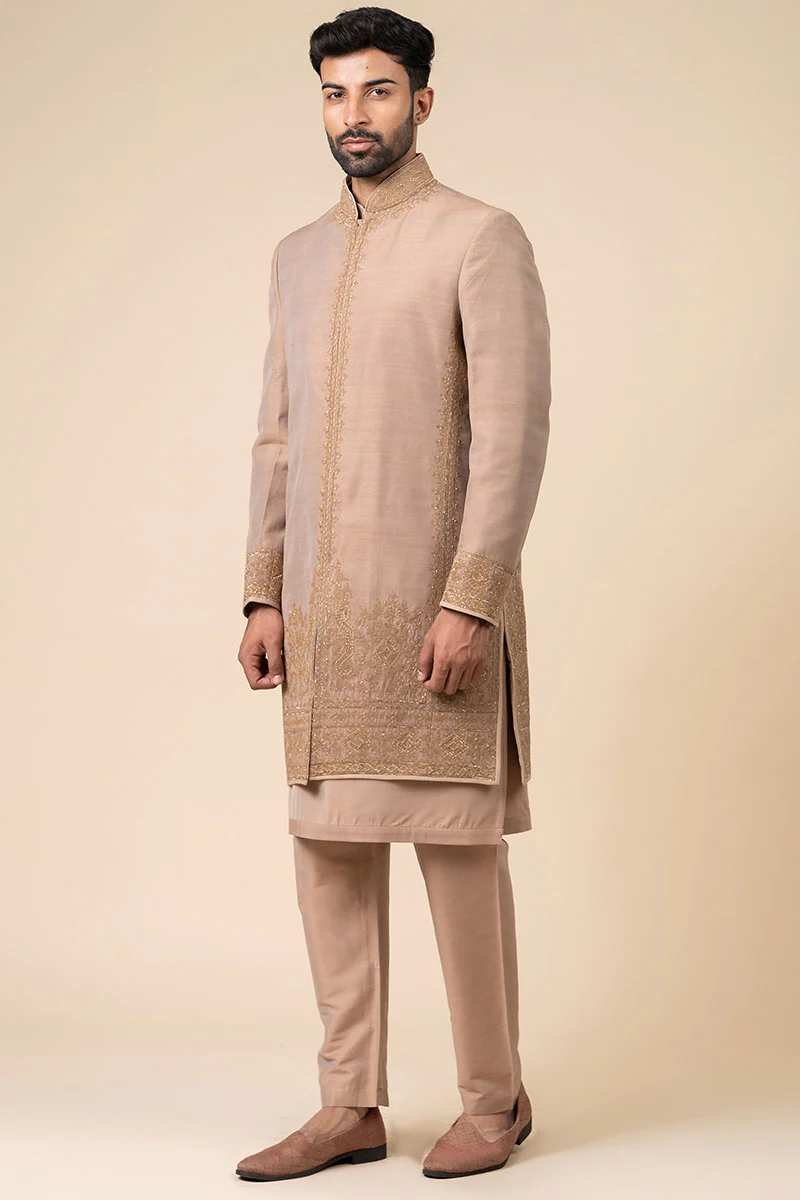 What truly sets this piece apart is its intricately embroidered collar, which adds structure, contrast, and artistry to the ensemble. The mandarin neckline and straight-cut silhouette are tailored for a clean, refined fit that enhances posture and presence. Designed for comfort and grandeur, it’s ideal for day weddings, engagement ceremonies, or elegant evening affairs.