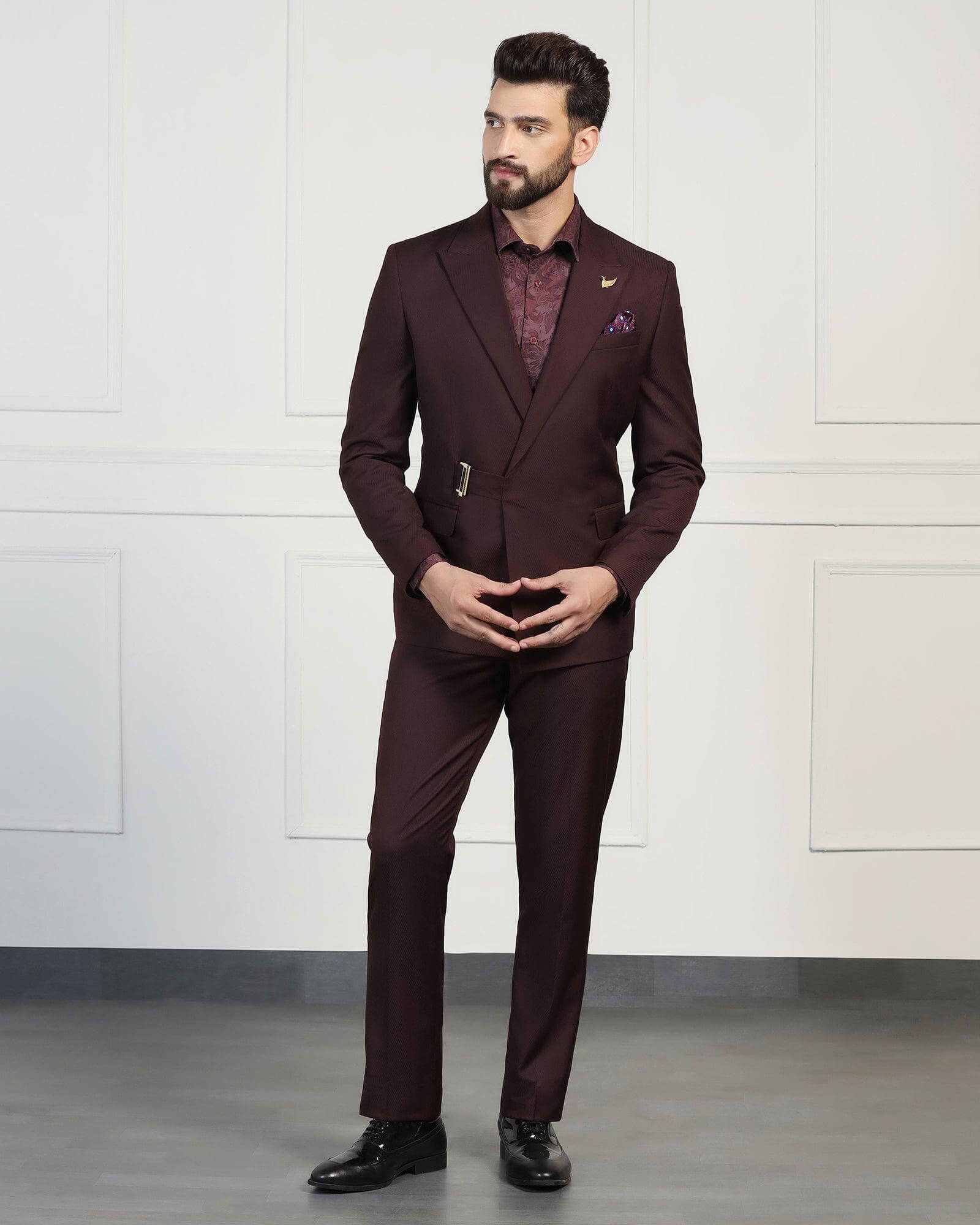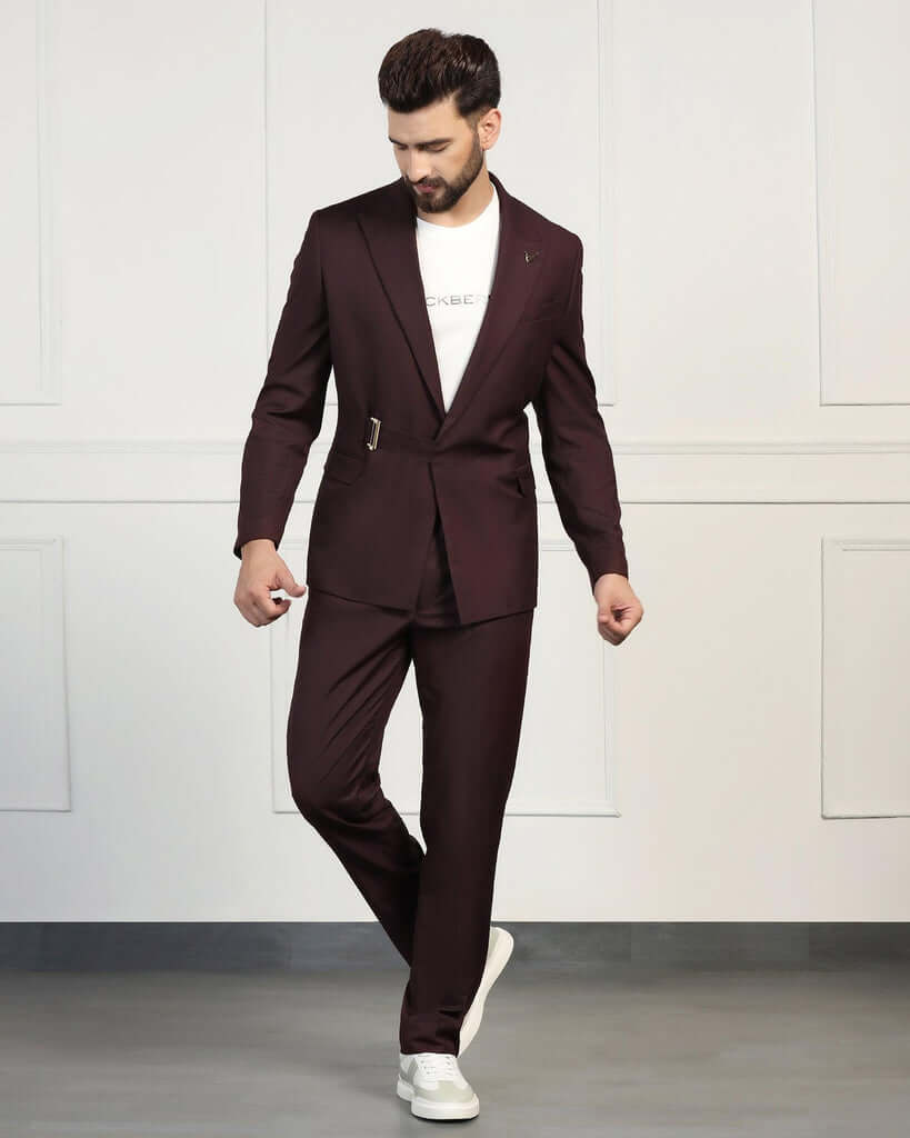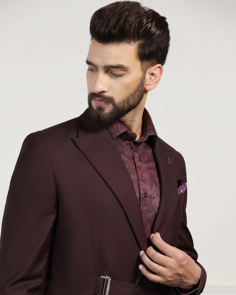 Elevate your style with this Wine Ceremonia Suit. Featuring a refined pattern intricately woven into the woolen fabric, this suit ensures a distinguished appearance and is a staple of the wedding collection. Tailored in a slim fit with a mid-rise waist, it offers a sleek silhouette that exudes confidence. Neatly crafted with an additional 2.5 inches of stretchable comfort at the waist and complete with practical flap pockets, this men’s suit ensures a perfect fit and is a standout choice for the classy gentleman.