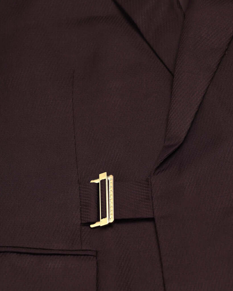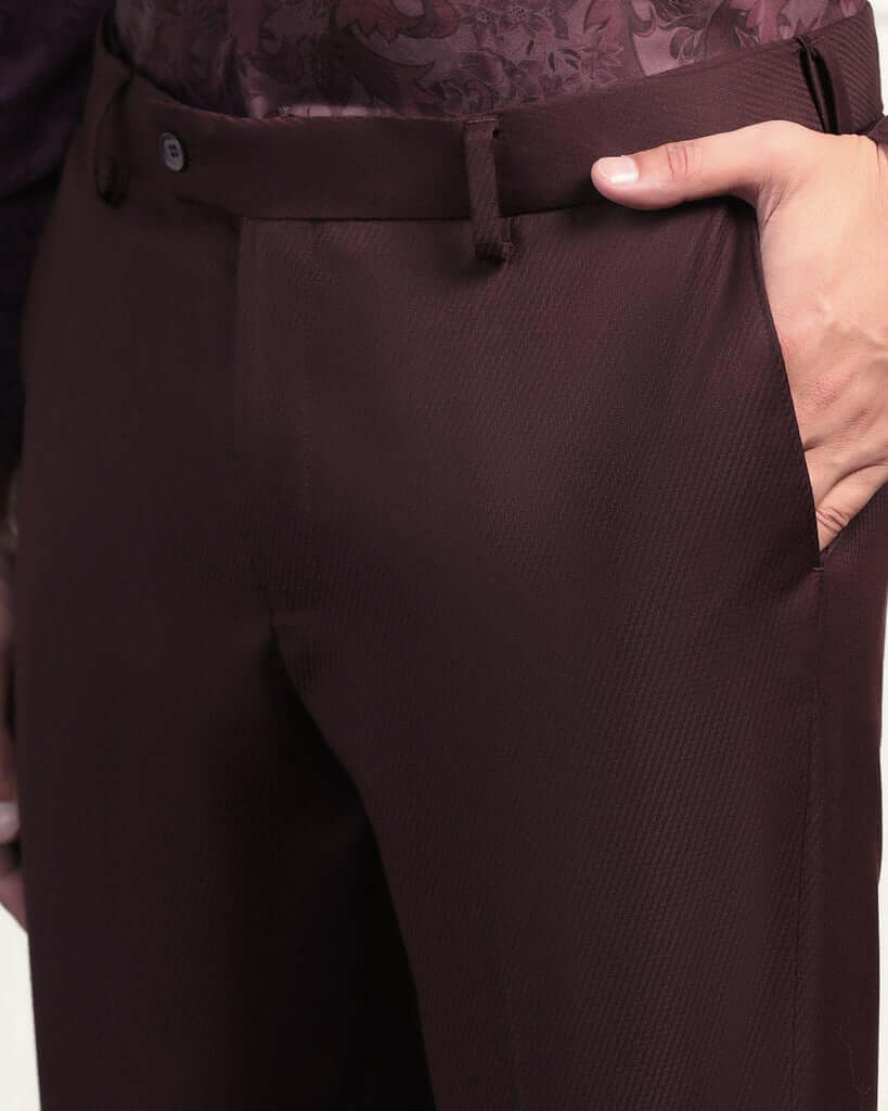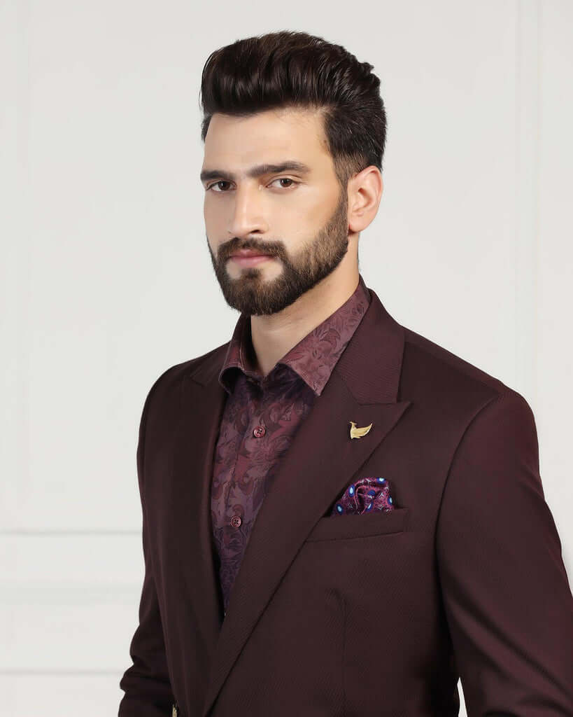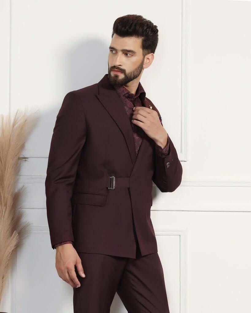 Elevate your style with this Wine Ceremonia Suit. Featuring a refined pattern intricately woven into the woolen fabric, this suit ensures a distinguished appearance and is a staple of the wedding collection. Tailored in a slim fit with a mid-rise waist, it offers a sleek silhouette that exudes confidence. Neatly crafted with an additional 2.5 inches of stretchable comfort at the waist and complete with practical flap pockets, this men’s suit ensures a perfect fit and is a standout choice for the classy gentleman.